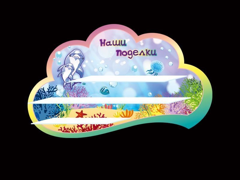 Стенд «Наши поделки» для оформления группы в детском саду «Дельфинята». Красочный, яркий стенд для таких же ярких и оригинальных поделок детишек. На стенде размещены полочки для поделок детей оптимального размера, не закрывая дизайн стенда, в стиле группы «Дельфинята».