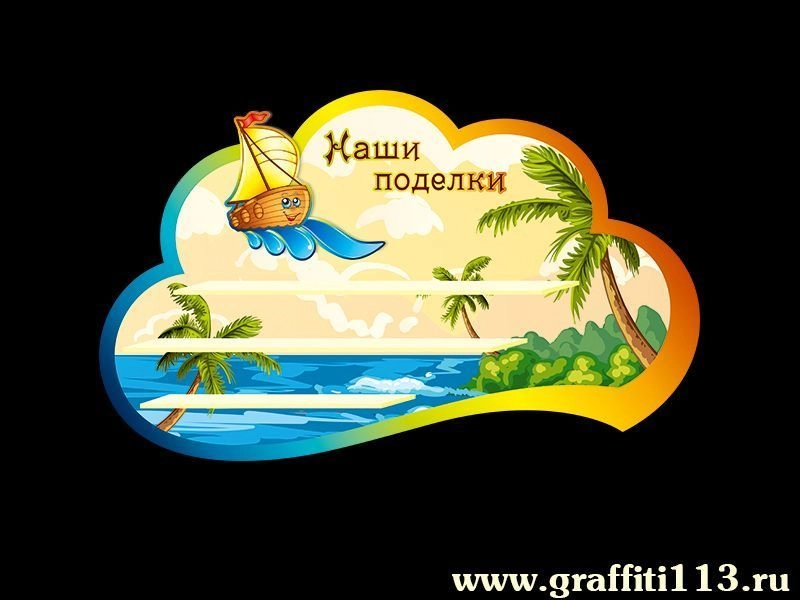 Стенд «Наши поделки» для оформления группы «Кораблик» в детском саду. Красочный, яркий стенд для таких же ярких и оригинальных поделок детишек. На стенде размещены полочки для поделок оптимального размера, не закрывая дизайн стенда, в стиле группы детского сада «Кораблик». Стенд оснащен тремя полками.