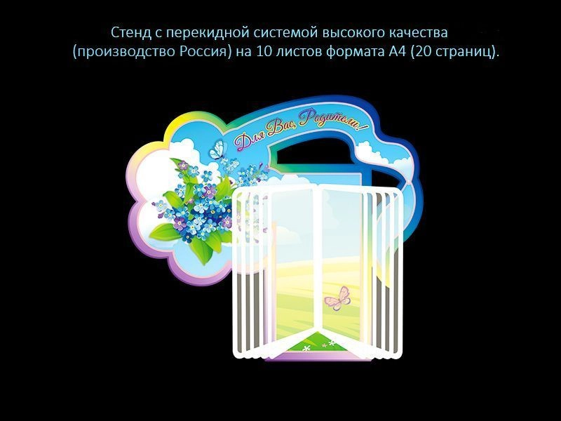 Стенд «Для Вас, родители» оформленный в стиле группы «Незабудки», разработан специально для удобного и полного представления информации. Благодаря перекидной системе на 20 страниц, прикрепленной на стенде, можно разместить большое количество информации, чтобы родители знали все о работе детского сада и предстоящих мероприятиях.