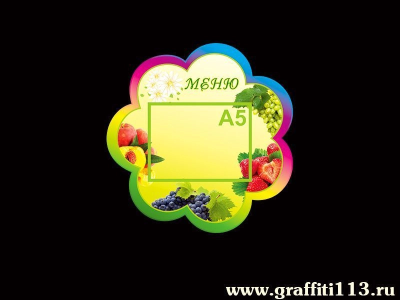 Стенд «Меню» для группы детского сада «Ромашка», выполнен в форме цветка, необычный и сочный, повторяет общий стиль оформления группы детского сада «Ромашка». Удобен для размещения ежедневного меню детишек, благодаря карману формата А5, расположенному на данном стенде.