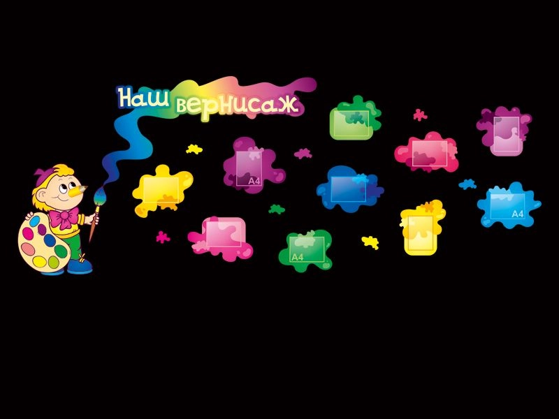 Декоративный стенд для детских рисунков "Наш вернисаж" с карманами А4 формата. Общий размер композиции указан с учётом интервалов между элементами.