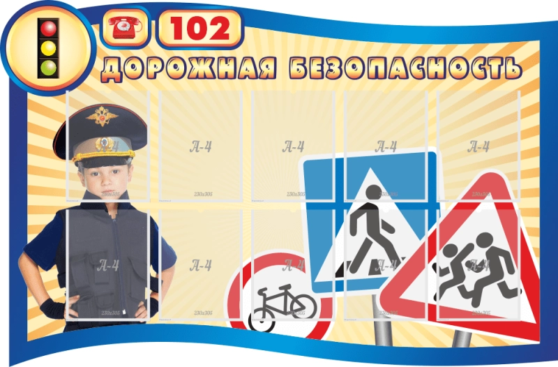 Стенд информационный "ДОРОЖНАЯ БЕЗОПАСНОСТЬ" для размещения в фойе школы, детского сада и любого образовательного учреждения. На стенде могут быть размещены основные знаки дорожного движения, касающиеся пешехода, а также изображения с правилами безопасного перехода автомобильной дороги, для этого на стенде предусмотрены карманы.