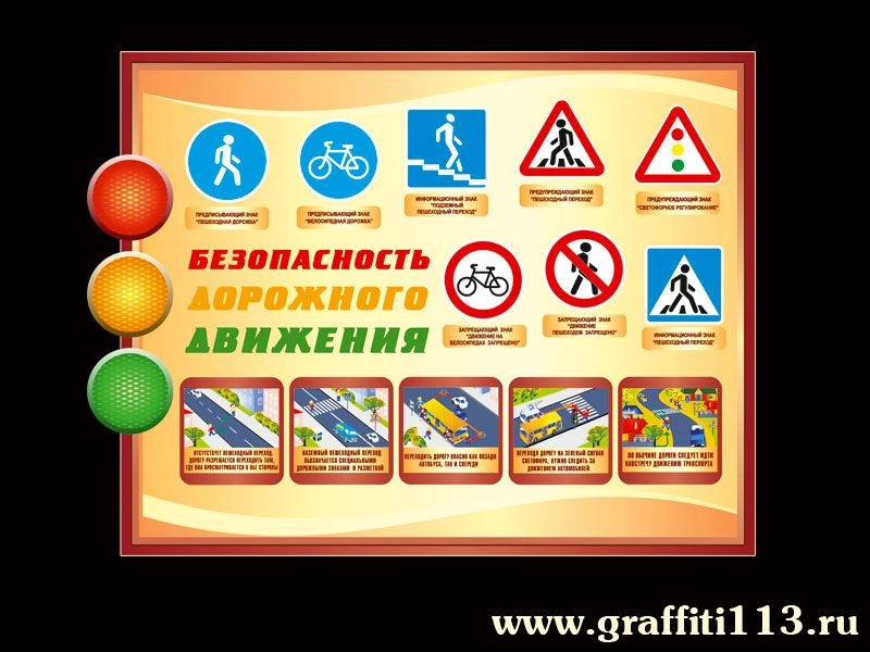 Стенд информационный "БЕЗОПАСНОСТЬ ДОРОЖНОГО ДВИЖЕНИЯ" для размещения в фойе школы, детского сада и любого образовательного учреждения. На стенде изображены основные знаки дорожного движения, касающиеся пешехода, а также изображения с правилами безопасного перехода автомобильной дороги.