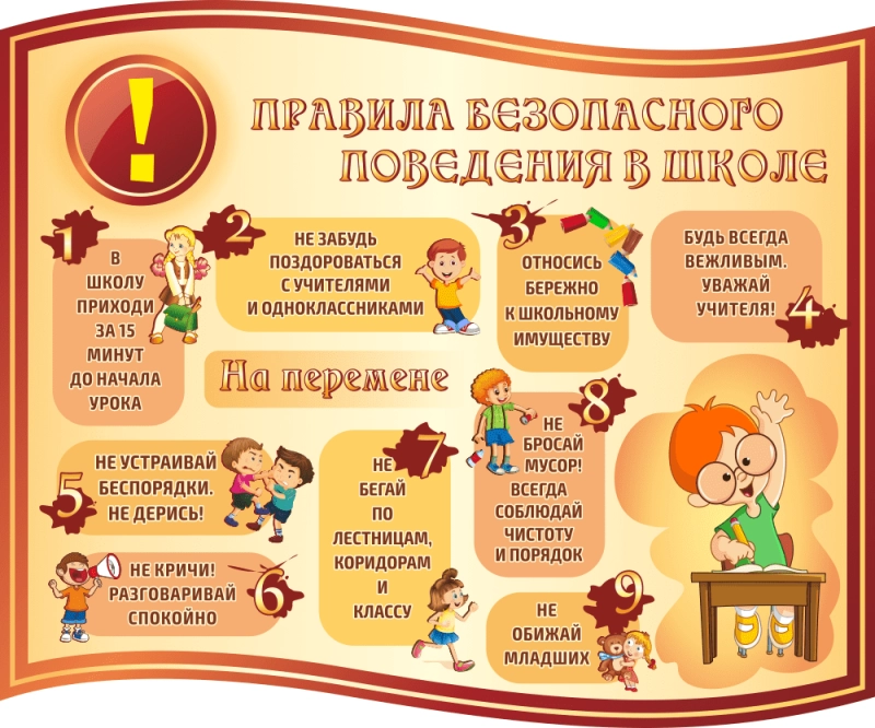 Стенд информационный "Правила безопасного поведения в школе" с наглядными изображениями и простыми тезисными описаниями правил поведения в школе.