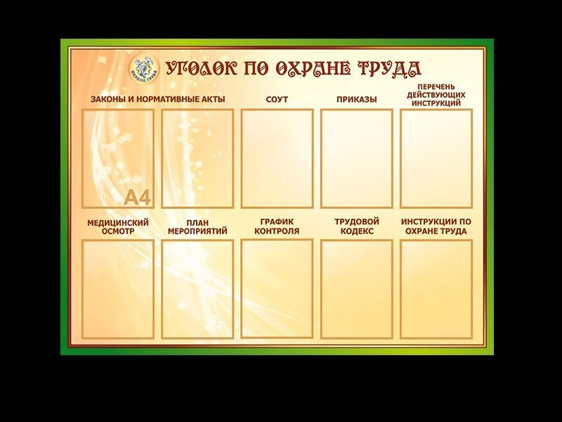 Стенд "УГОЛОК ПО ОХРАНЕ ТРУДА" для размещения в холле образовательных и других учреждений. Стенд выполнен в классическом стиле, лаконичной форме и цветовой гамме. На стенде предусмотрены карманы А4 формата для размещения актуальной информации.