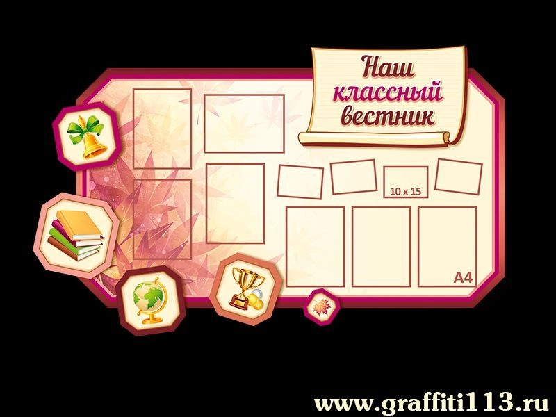 Информационный стенд "Наш классный вестник" для размещения в любом школьном кабинете, выполнен в современном молодёжном стиле с декоративными элементами в виде красочных иконок. На стенде предусмотрено большое количество кармашков, как для актуальной информации, так и для фотографий из жизни класса.