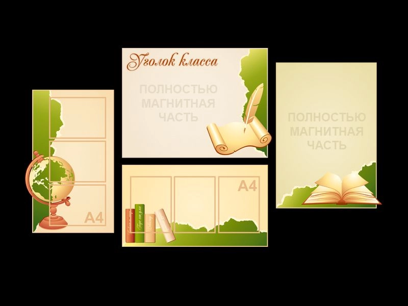 Стенд "Уголок класса" в бежево-оливковых тонах, разработан для размещения большого количества актуальной информации. Стенд представляет собой композицию из четырёх отдельных частей, две из которых являются полностью магнитными. На двух других размещены карманы А4 формата.