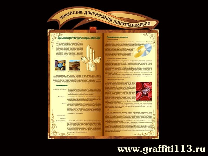 Информационный стенд "Новейшие достижения нанотехнологии" выполнен из вспененного пластика ПВХ 4 мм. Изображение - интерьерная печать на глянцевой пленке экосольвентными чернилами, с разрешением 1440 dpi.