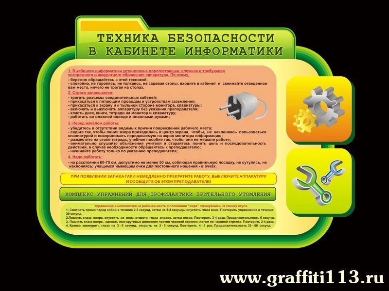 Стенд информационный "Техника безопасности в кабинете информатики" один из важнейших информационных носителей для размещения в школьном кабинете информатики, поскольку повествует учащимся о правилах безопасной работы с компьютером и его составляющими.
