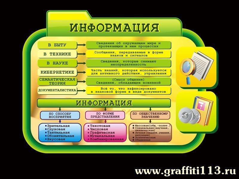 Лаконичные, в своем исполнении, стенды для кабинета информатики, содержат важную информацию по теме. А яркие элементы в оформлении стенда помогают ученикам хорошо запомнить новый материал на уровне зрительной памяти.