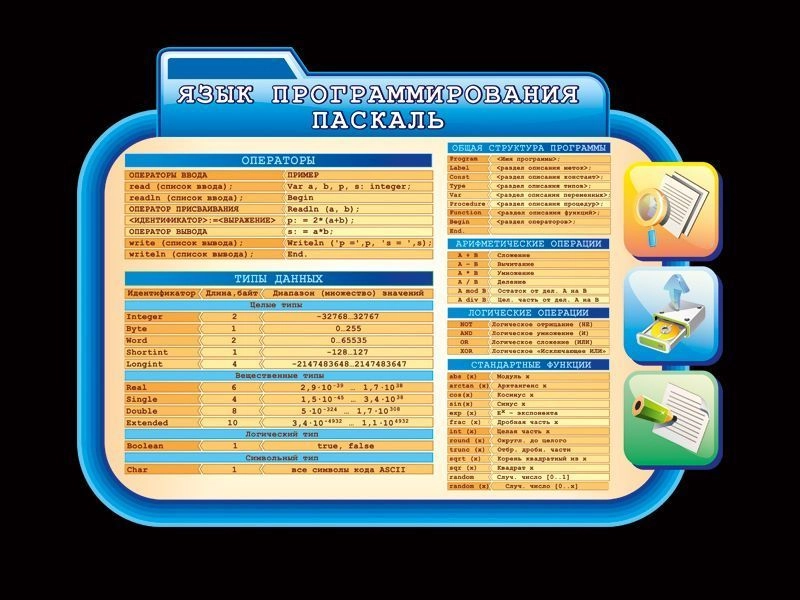 Стенд информационный "Язык программирования - Паскаль" для размещения в кабинете информатики в школе.