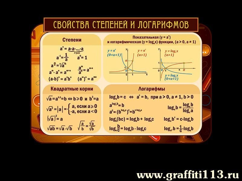Стенд информационный для кабинета математики "Свойства степеней и логарифмов" разработан в помощь учителю.