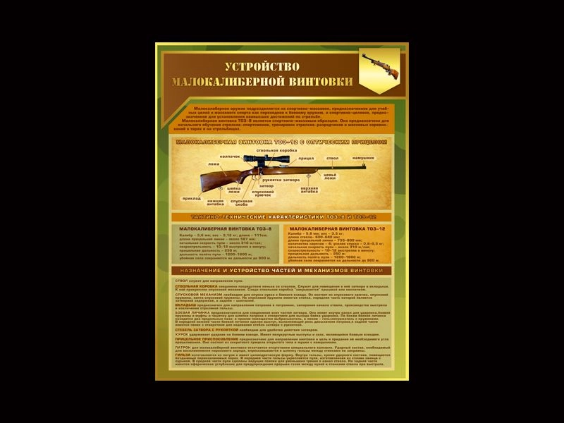 Стенд "Устройство малокалиберной винтовки" для оформления кабинета ОБЖ. На стенде размещена информация по теме, соответствующие изображения. Стенд разработан с учетом современных тенденций в дизайне, благодаря чему молодое поколение непременно обратит внимание на стенд, а значит и на информацию на нём.