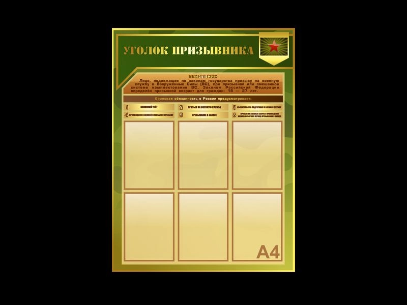 Информационный стенд "Уголок призывника" с 6 карманами А4 разработан для размещения в кабинете ОБЖ школы или колледжа.
