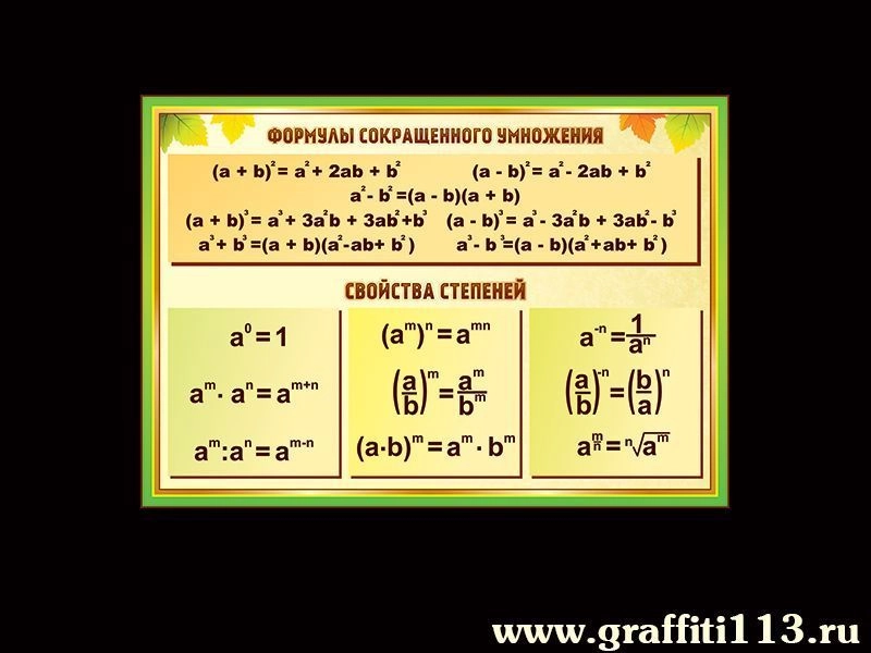 Наглядное пособие по математике "Формулы сокращенного умножения. Свойства степеней", для размещения в кабинете математики, станет помощником для учеников и учителя. А приятный дизайн освежит интерьер класса.