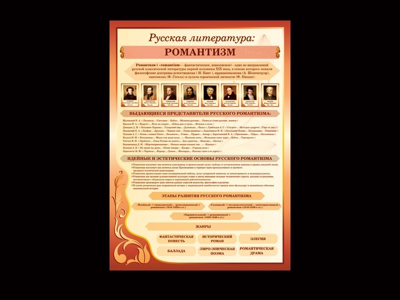 Наглядное пособие по литературе "Романтизм". Красочное и стильное наглядное пособие по литературу не только поможет детям освоить новый материал по теме, но и украсит стены кабинета.