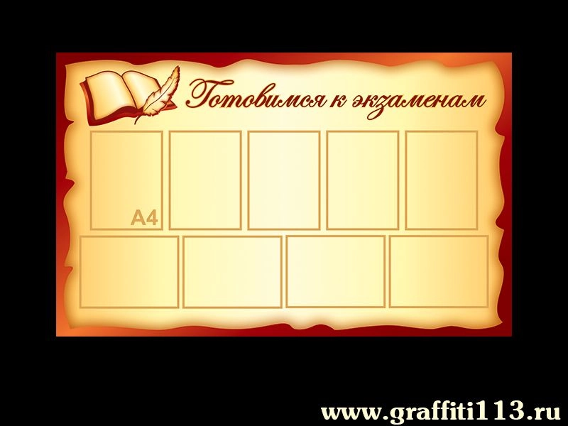 Стенд "Готовимся к экзаменам" для оформления кабинета русского языка и литературы, разработан для размещения необходимой информации о предстоящих экзаменах, экзаменационных темах, результатов предварительного тестирования.