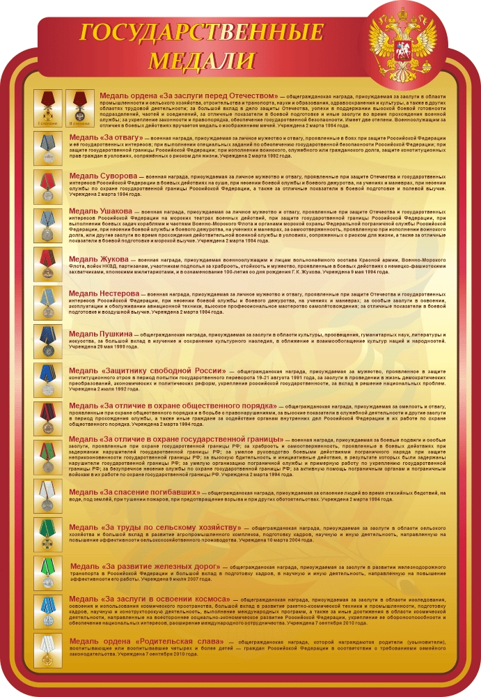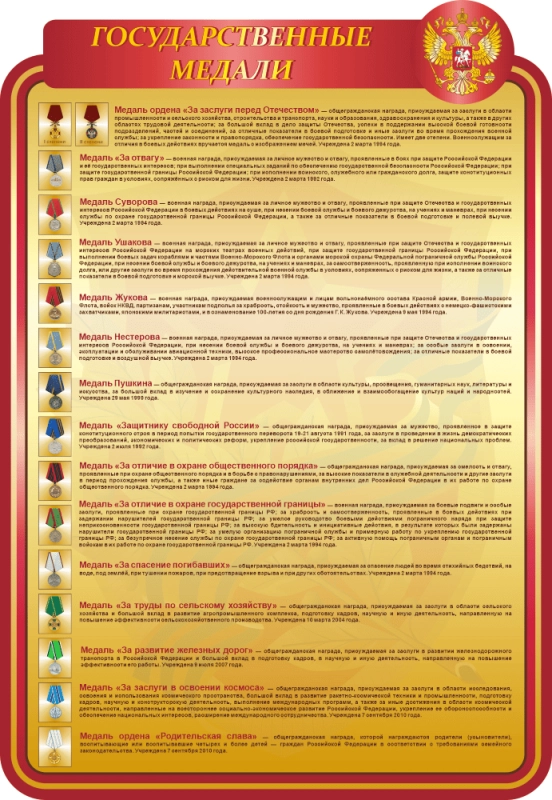 Строгий и лаконичный стенд «Государственные медали», несомненно, важный и необходимый для оформления. На стенде размещена информация о государственных медалях с их изображением и описанием.