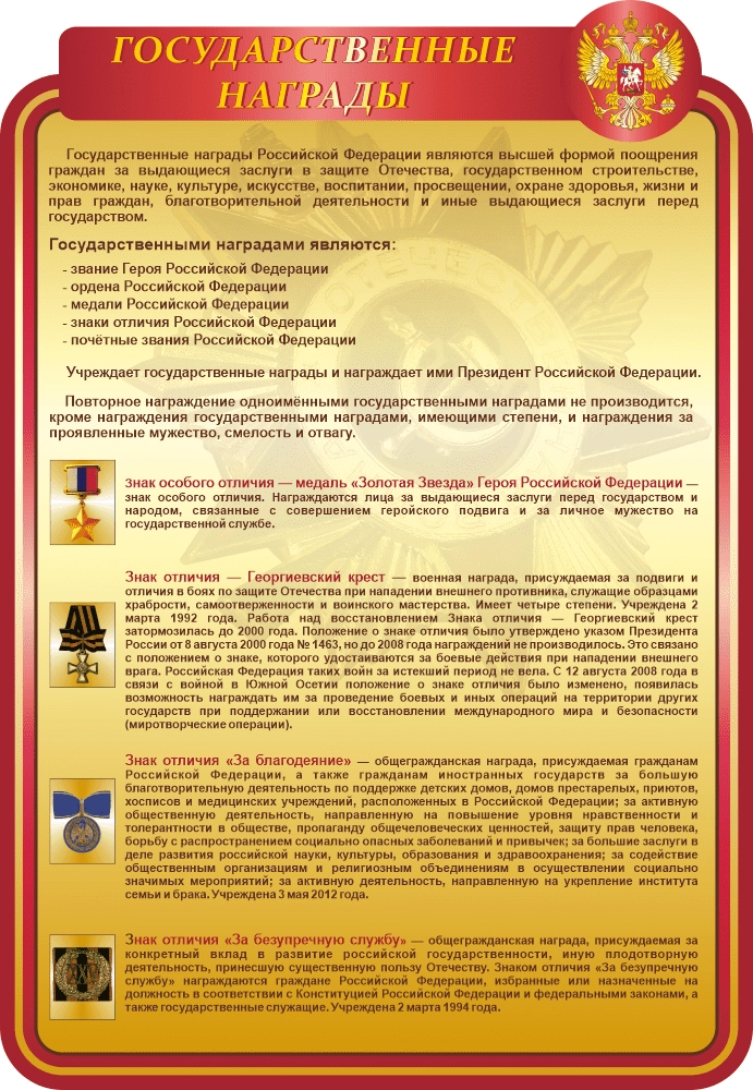 Строгий и лаконичный стенд «Государственные награды», несомненно, важный и необходимый для оформления. На стенде размещена информация о государственных медалях с их изображением и описанием.