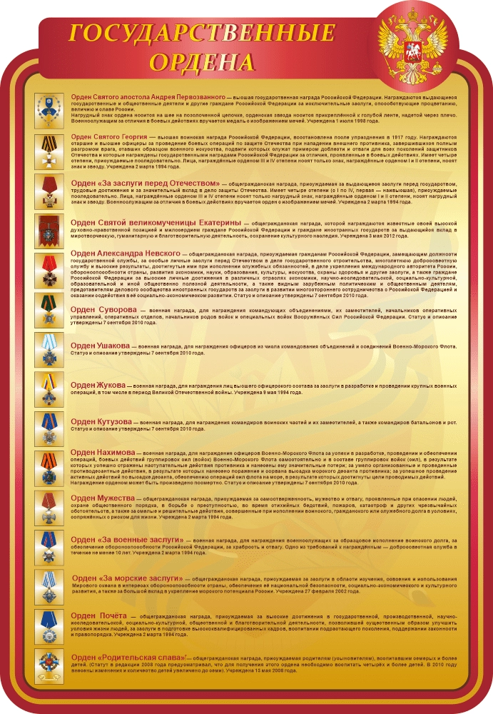 Строгий и лаконичный стенд «Государственные ордена», несомненно, важный и необходимый для оформления. На стенде размещена информация о государственных орденах с их изображением и описанием.