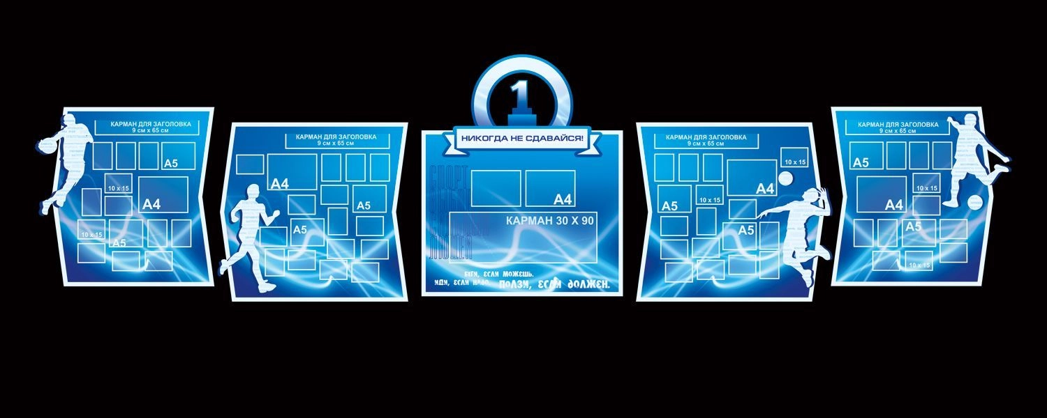 Большая композиция стендов разработана для демонстрации фотографий, которые освещают школьные спортивные события, а также чествуют призёров спортивных соревнований и спартакиад.