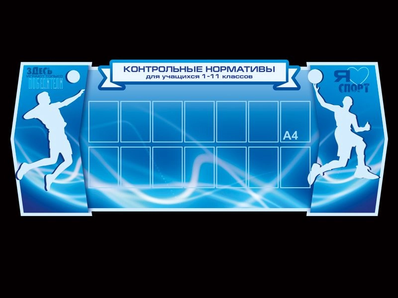 Большой стенд в спортивном стиле разработан для размещения информации о контрольных нормативах учащихся с первого по одиннадцатый класс.
