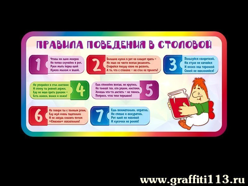 Яркий, красочный стенд "Правила поведения в стооловой" обязательно привлечёт внимание учащихся - понравится и запомнится!