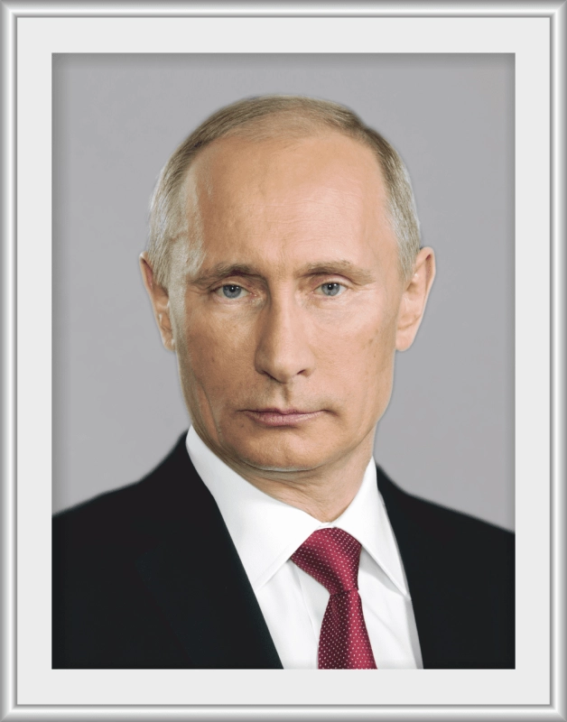 Портрет президента России изготовлен из пластика ПВХ, изображение - печать интерьерная экосольвентными чернилами, с разрешением печати 1440 dpi. Алюминиевая рамка Nielsen, цвет - серебро.