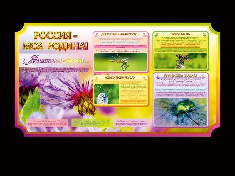 Школьный стенд о России "Маленькая страна" повествует своему читателю об исчезающих видах насекомых, которые обитают на территории России. Дизайн стенда выполнен в сочной цветовой гамме, содержит фотоизображения отличного качества. Такой стенд привлечет внимание как учащихся, так и гостей школы, а также станет оригинальным украшением любого помещения.