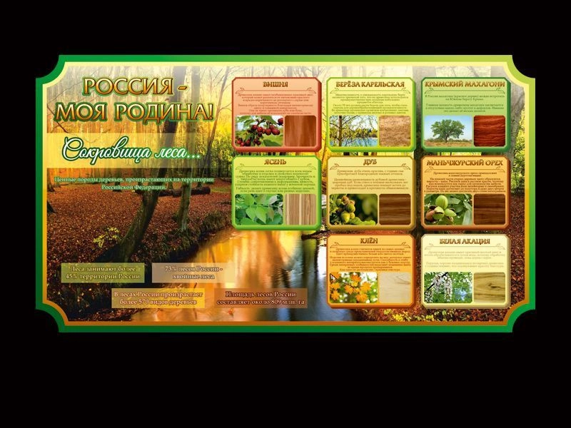 Стенд информационный "Сокровища леса" из большой коллекции стендов "МОЯ РОДИНА - РОССИЯ", расскажет своему читателю о ценных породах деревьев, произрастающих в Российских лесах и использующихся в деревообрабатывающей промышленности. Дизайн стенда выполнен в сочной цветовой гамме, содержит большое количество фотоизображений отличного качества. Такой стенд привлечет внимание как учащихся, так и гостей школы, а также станет оригинальным украшением любого помещения.