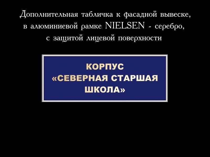 Дополнительная табличка к фасадной вывеске школы, для обозначения каждого отдельного корпуса, изготовлена из пластика ПВХ 3 мм, изображение - печать интерьерная с разрешением 1440 dpi. Фасадная вывеска обрамлена алюминиевым профилем Nielsen №2 - глянцевое серебро. Лицевая поверхность вывески имеет дополнительную защиту от неблагоприятных погодных условий в виде глянцевой пленки высокого качества, толщиной 80 мкм.