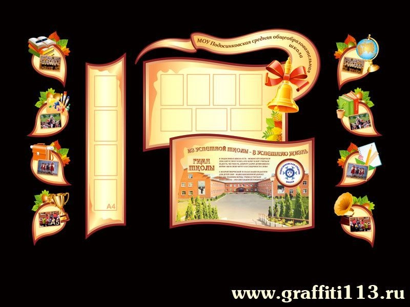 Цветовую гамму и наполнение стенда можно изменить по вашему пожеланию. Общий размер композиции указан с учетом интервалов между элементами.