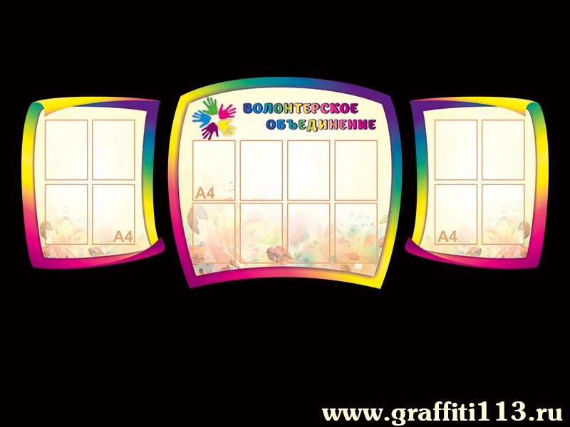 Красочный стенд "Волонтёрское объединение", состоящий из 3 частей. На стенде расположено 16 карманов формата А4.