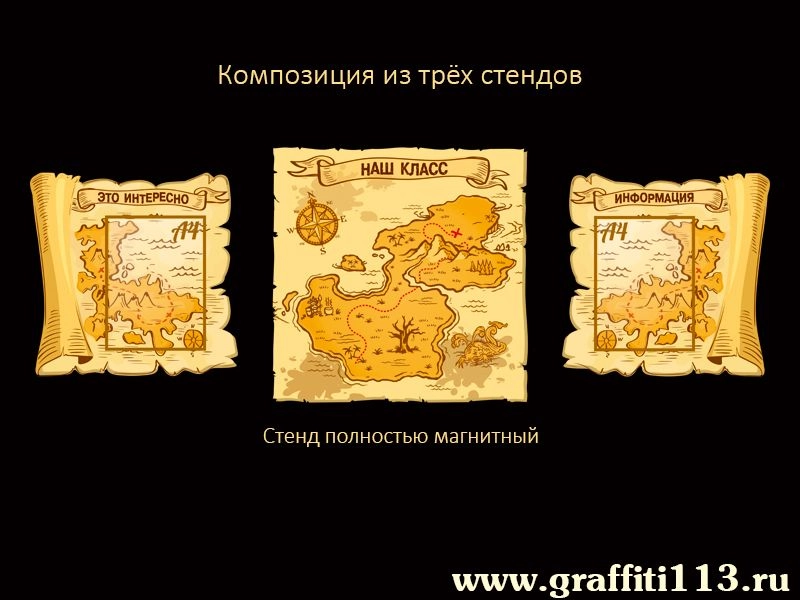 Композиция стендов "Карта сокровищ" для размещения в кабинете начальной школы, включает в себя 2 стенда с карманом А4 и 1 полностью магнитный стенд.