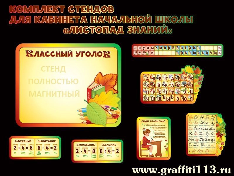 Большой и красочный комплект стендов для оформления кабинета начальной школы - "Листопад знаний", включает в себя большой магнитный стенд "Классный уголок" с комплектом неодимовых магнитов, и шесть стендов-пособий для наиболее удобного изучения материала в начальных классах. Магнитный стенд имеет защитное покрытие от царапин и стирания.