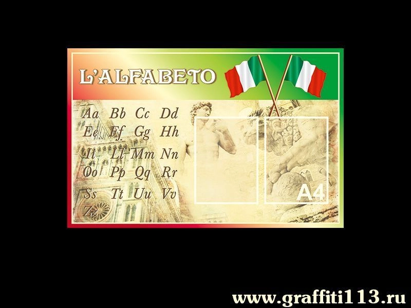 При изучении любого языка, самым первым и главным является изучение алфавита! Классический стенд небольшого размера с итальянским алфавитом, станет незаменимым элементом в оформлении кабинета иностранного языка в школе или языковом клубе. На стенде предусмотрены карманы формата А4, где вы можете разместить информацию об особенностях произношения.