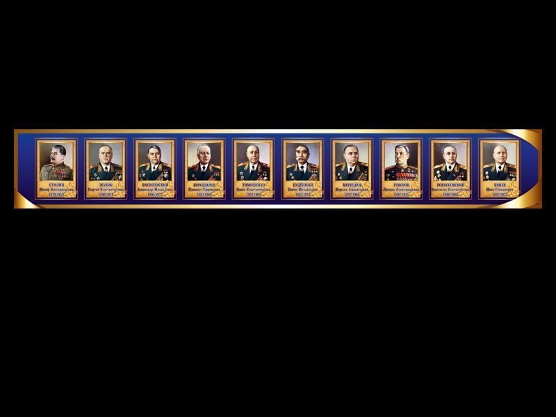 Портреты полководцев в кадетский класс в парадном оформлении, в золотисто-синей цветовой гамме.