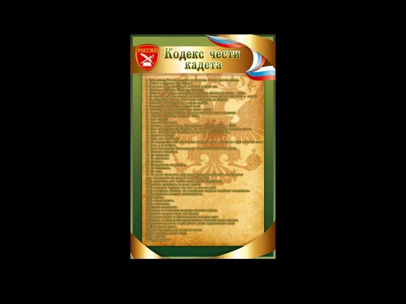Стенд с кодексом чести кадета в золотом оформлении с зеленой рамкой для расположения в кадетском классе школы.