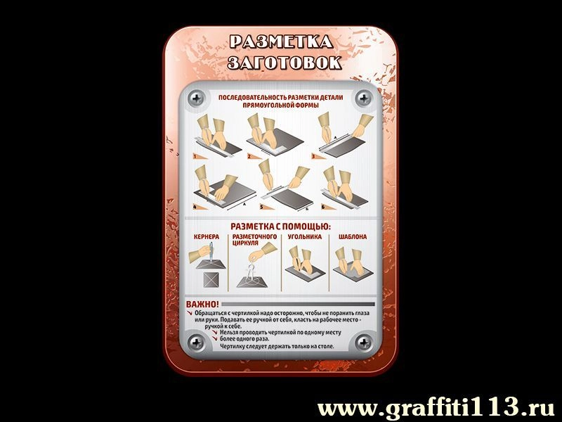 Наглядное пособие "РАЗМЕТКА ЗАГОТОВОК" для оформления слесарной мастерской в школе или колледже. Пособие разработано для того, чтобы упростить процесс представления новой информации по предмету и активизировать работу зрительной памяти у учащихся.