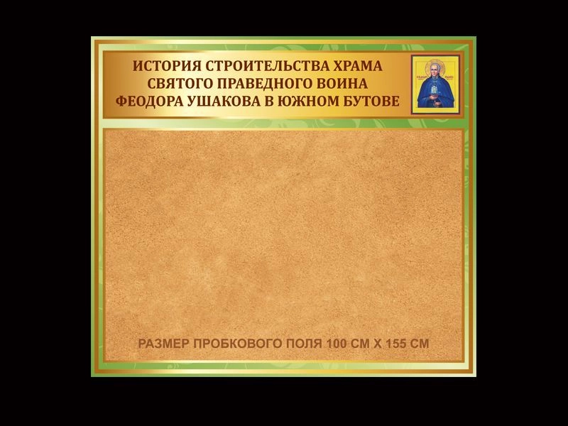 Большой и красочный стенд с пробковым полем для размещения истории строительства храма.