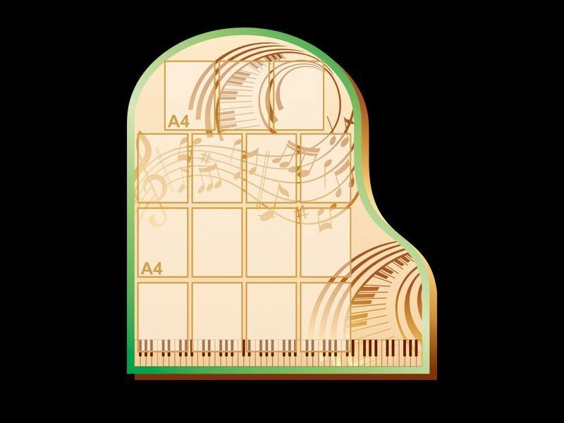 Стенд в форме рояля для музыкальной школы на котором расположено 15 карманов формата А4.