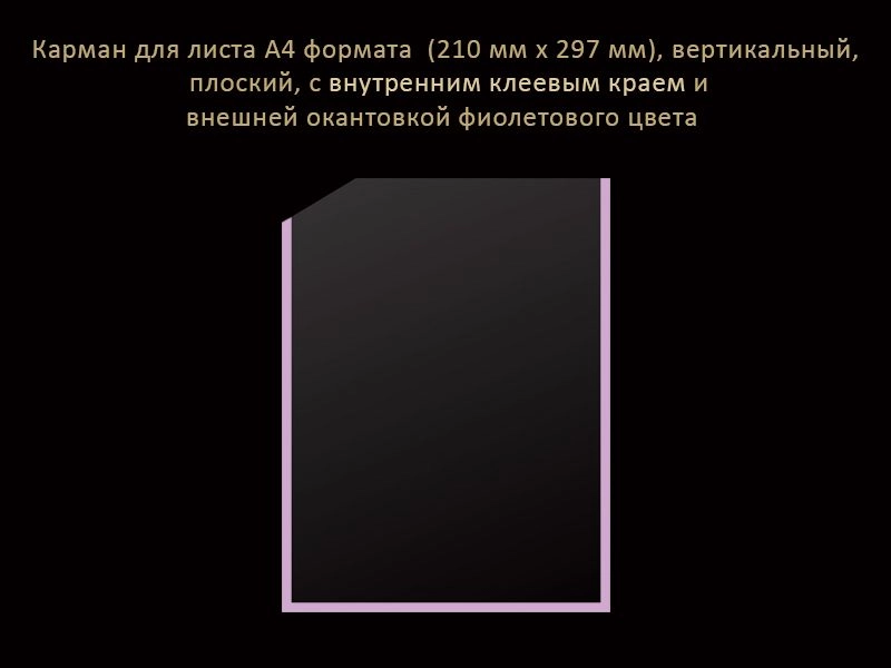 Карман вертикальный плоский, для размещения листа А4 формата (210 мм х 297 мм), с внутренним клеевым краем и внешней окантовкой фиолетового цвета.