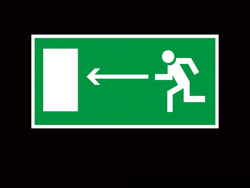 Наклейка безопасности "Запасной выход - направление". Изготовлена из белой самоклеющейся пленки.