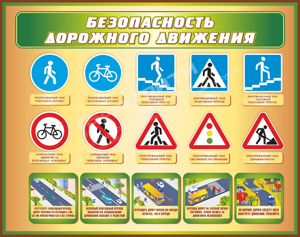 На стенде изображены основные знаки дорожного движения, касающиеся пешехода, а также изображения с правилами безопасного перехода автомобильной дороги.