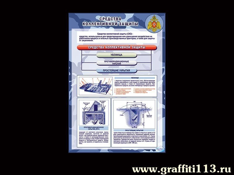 Наглядное пособие по Гражданской обороне "Средства коллективной защиты" для размещения в кабинете школы, колледжа или ВУЗа. Подробное пособие раскрывает тему средств защиты, таких как простейшие укрытия, убежища и противорадиационные укрытия.