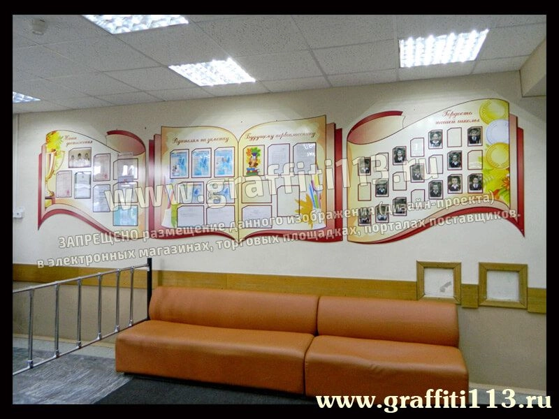 Оформление стендов школьных достижений для ЦО «Самбо-70» выполнено в бежево-персиковых тонах с обрамлением, насыщенного шоколадного оттенка. Благодаря необычной композиции, ярким элементам, и гармоничной цветовой гамме, стенды идеально вписались в интерьер, подчеркнув неповторимый характер школы, стремление её учащихся и преподавателей сделать свой второй дом чуть-чуть лучше!