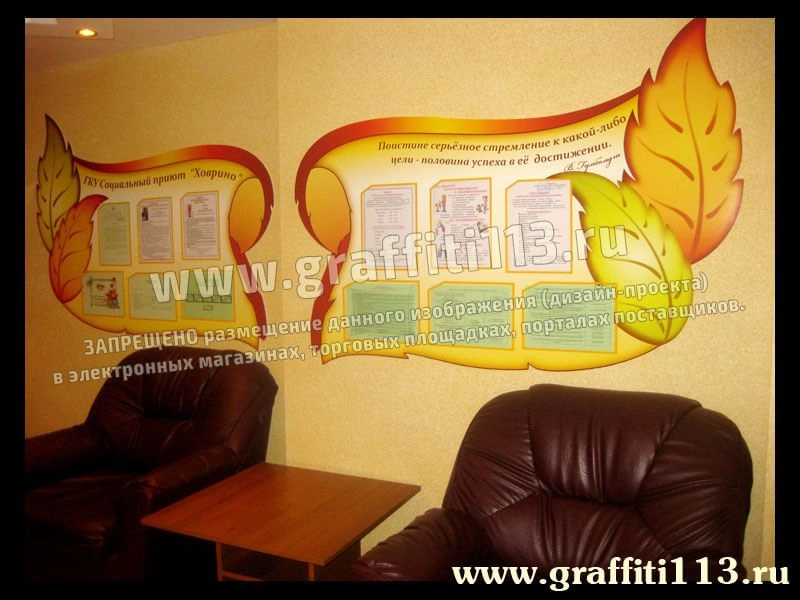 Оформление приюта в Ховрино было, для дизайнеров компании "Граффити" интересной и почётной задачей. Для оформления фойе была выбрана лёгкая, осенняя тема стенда, созвучная с песочными стенами и водопадом в интерьере. Совместными усилиями с директором приюта, мы добились необходимого результата - полного слияния стенда с интерьером, а также получили положительные отзывы о нашей работе, на самых разных уровнях.